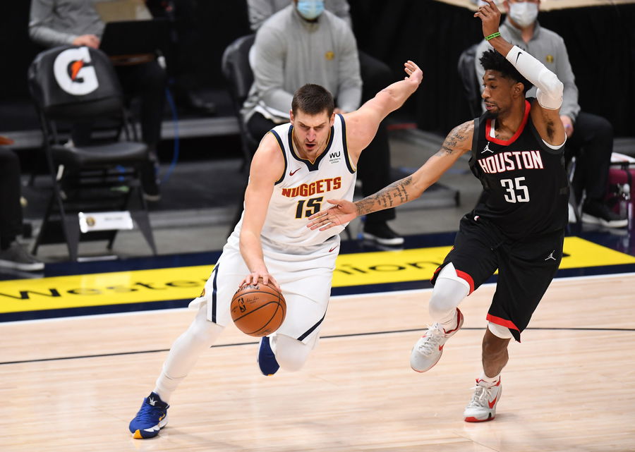 Dec 28, 2020; Denver, Colorado, USA; Denver Nuggets center Nikola Jokic (15) dribbles past Houston Rockets forward Christian Wood (35) in the first quarter at Ball Arena. Mandatory Credit: Ron Chenoy-USA TODAY Sports