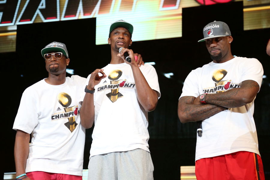 MIAMI, FL – JUNE 25: Dwyane Wade, Chris Bosh and LeBron James participate in the Miami Heat 2012 NBA Championship Celebration at AmericanAirlines Arena on June 25, 2012 in Miami, Florida. (Photo by Alexander Tamargo/WireImage)