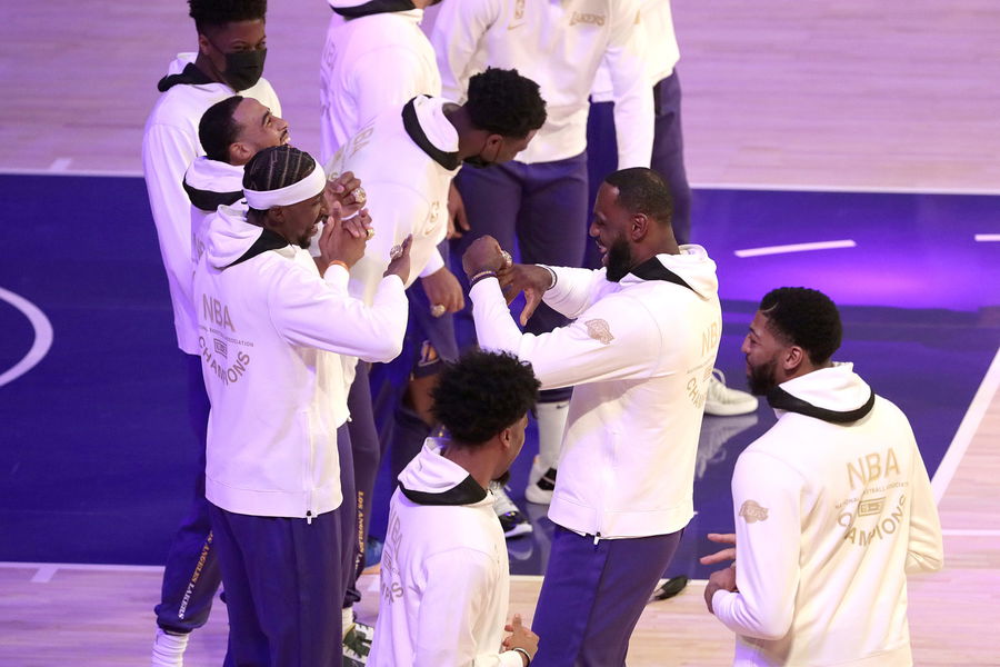 Los Angeles, CA, Tuesday, December 22, 2020 – LeBron James celebrates with teammates after receiving their NBA Championship rings at Staples Center. (Robert Gauthier/ Los Angeles Times via Getty Images)