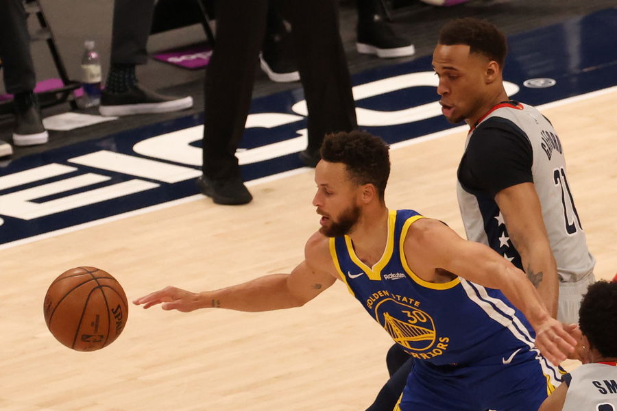 Apr 21, 2021; Washington, District of Columbia, USA; Golden State Warriors guard Stephen Curry dribbles the ball during a warmup prior to the Warriors’ game against the Washington Wizards at Capital One Arena. Mandatory Credit: Geoff Burke-USA TODAY Sports