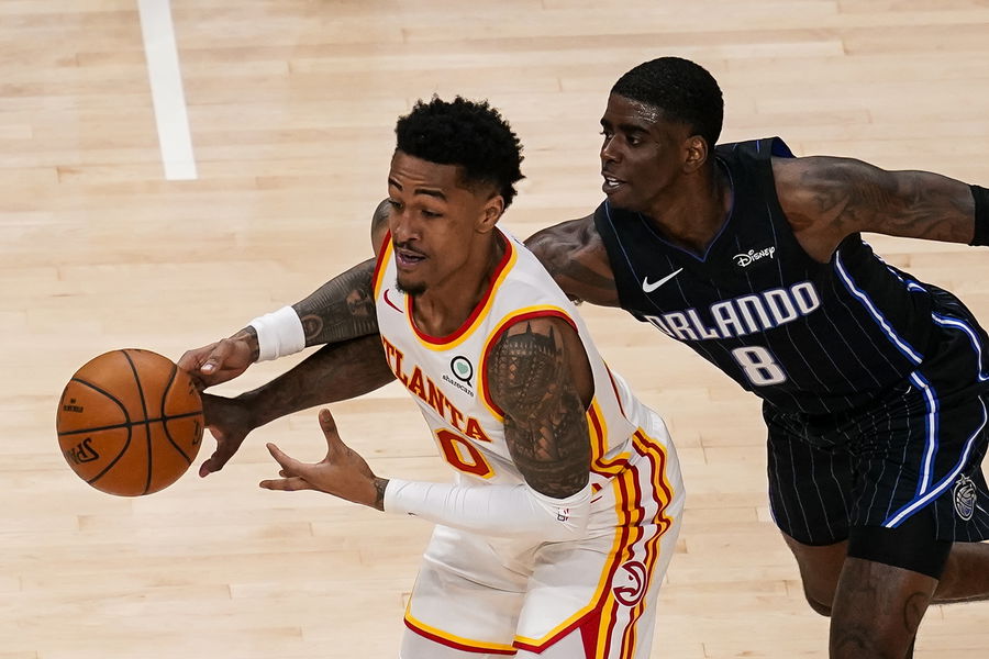 Dec 11, 2020; Atlanta, Georgia, USA; Atlanta Hawks forward John Collins (20) has the ball knocked away from him by Orlando Magic guard Dwayne Bacon (8) during the first half at State Farm Arena. Mandatory Credit: Dale Zanine-USA TODAY Sports