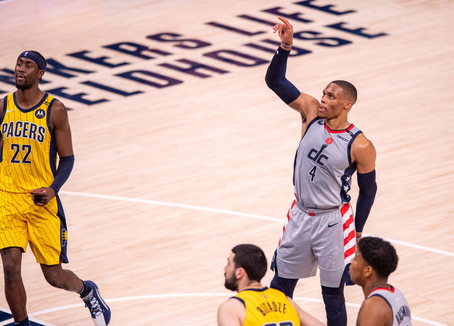 May 8, 2021; Indianapolis, Indiana, USA; Washington Wizards guard Russell Westbrook (4) reacts as hitting the game winning free throw during an overtime period against the Indiana Pacers at Bankers Life Fieldhouse. Mandatory Credit: Doug McSchooler-USA TODAY Sports