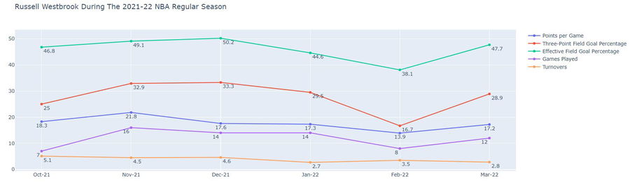 Russell Westbrook During The 2021-22 NBA Regular Season (Stats Valid as of 22nd March 2022)
