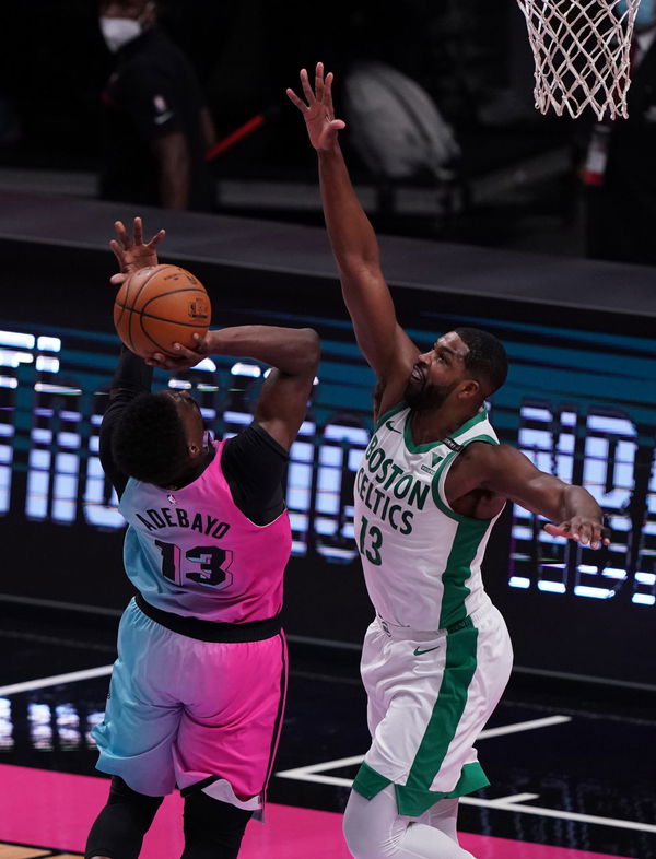 Jan 6, 2021; Miami, Florida, USA; Miami Heat center Bam Adebayo (13) shoots the ball against Boston Celtics center Tristan Thompson (13) during the first half at American Airlines Arena. Mandatory Credit: Jasen Vinlove-USA TODAY Sports