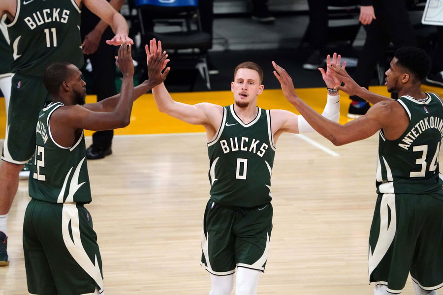 Mar 31, 2021; Los Angeles, California, USA; Milwaukee Bucks guard Donte DiVincenzo (0) celebrates with forward Khris Middleton (22) and forward Giannis Antetokounmpo (34) in the second half against the Los Angeles Lakers at Staples Center. Mandatory Credit: Kirby Lee-USA TODAY Sports