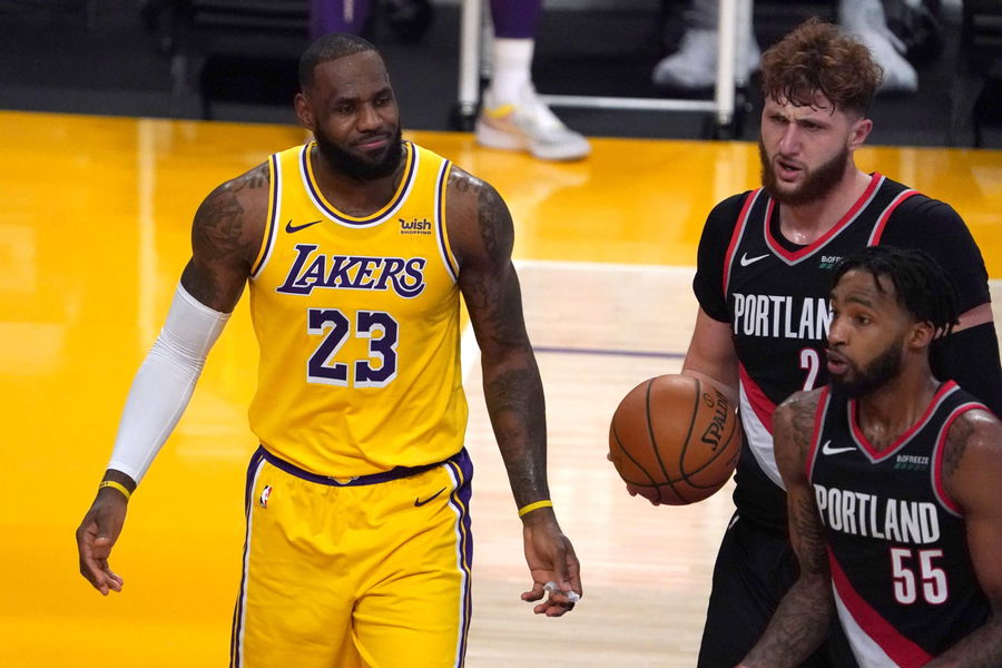 Dec 28, 2020; Los Angeles, California, USA; Los Angeles Lakers forward LeBron James (23) and Portland Trail Blazers center Jusuf Nurkic (27) and forward Derrick Jones Jr. (55) react in the fourth quarter at Staples Center. The Trail Blazers defeated the Lakers 115-107. Mandatory Credit: Kirby Lee-USA TODAY Sports