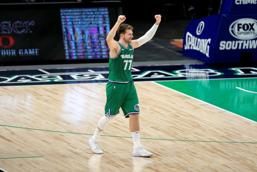 Feb 8, 2021; Dallas, Texas, USA; Dallas Mavericks guard Luka Doncic (77) reacts after scoring during the second half against the Minnesota Timberwolves at American Airlines Center. Mandatory Credit: Kevin Jairaj-USA TODAY Sports