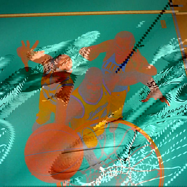 INGLEWOOD, CA – 1996: Shaquille O’Neal #34, Kareem Abdul Jabbar #33and George Mikan #11 of the Los Angeles Lakers pose for a portrait circa 1996 in Inglewood, California. (Photo by Peter Read Miller/NBAE via Getty Images)