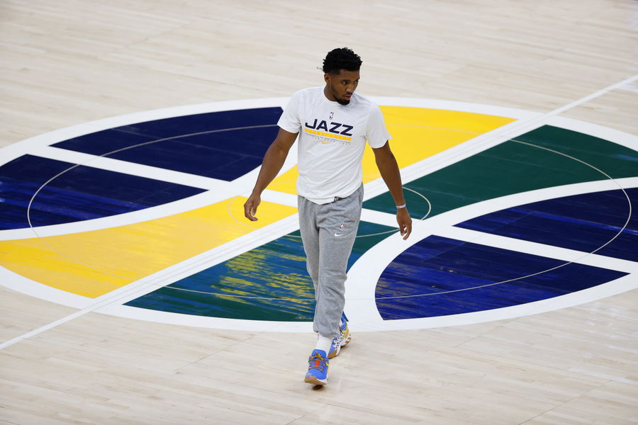 Dec 12, 2020; Salt Lake City, Utah, USA; Utah Jazz guard Donovan Mitchell (45) prepares for their game against the Phoenix Suns at Vivint Smart Home Arena. Mandatory Credit: Jeffrey Swinger-USA TODAY Sports
