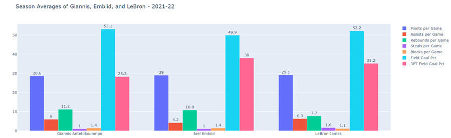Season Averages of Giannis, Embiid, and LeBron (Stats valid as of Jan 27th, 2022)