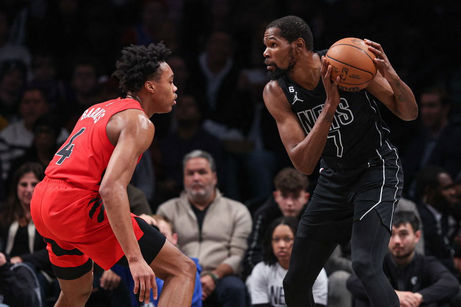 Dec 2, 2022; Brooklyn, New York, USA; Brooklyn Nets forward Kevin Durant (7) shields the ball from Toronto Raptors forward Scottie Barnes (4) during the first half at Barclays Center. Mandatory Credit: Vincent Carchietta-USA TODAY Sports