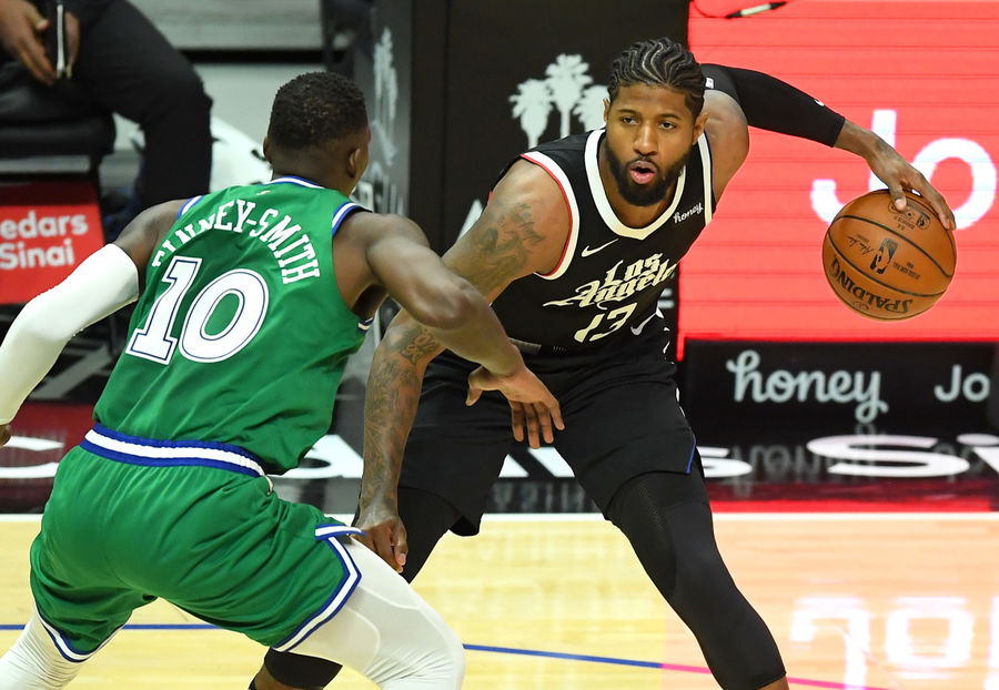 Dec 27, 2020; Los Angeles, California, USA; Los Angeles Clippers guard Paul George (13) controls the ball against Dallas Mavericks forward Dorian Finney-Smith (10) in the first half at Staples Center. Mandatory Credit: Jayne Kamin-Oncea-USA TODAY Sports