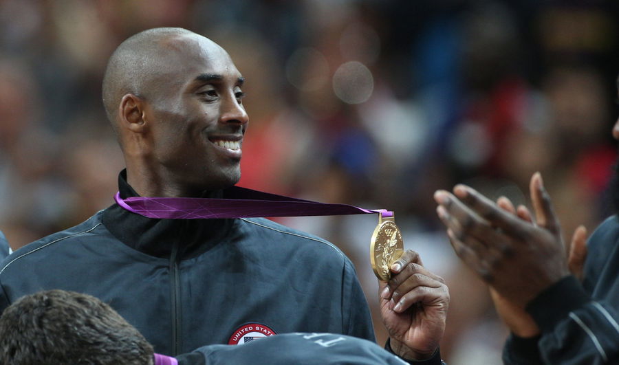 Kobe Bryant, USA, with his Gold Medal during the Men’s Basketball Final between USA and Spain at the North Greenwich Arena during the London 2012 Olympic games. London, UK. 12th August 2012. Photo Tim Clayton (Photo by Tim Clayton/Corbis via Getty Images)