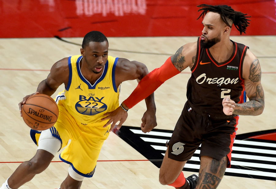 Mar 3, 2021; Portland, Oregon, USA; Golden State Warriors forward Andrew Wiggins (22) drives to the basket on Portland Trail Blazers guard Gary Trent Jr. (2) during the first quarter of the game at Moda Center. Mandatory Credit: Steve Dykes-USA TODAY Sports
