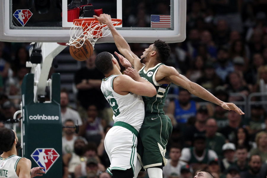May 13, 2022; Milwaukee, Wisconsin, USA; Milwaukee Bucks forward Giannis Antetokounmpo (34) dunks against Boston Celtics forward Grant Williams (12) during the fourth quarter during game six of the second round for the 2022 NBA playoffs at Fiserv Forum. Mandatory Credit: Jeff Hanisch-USA TODAY Sports