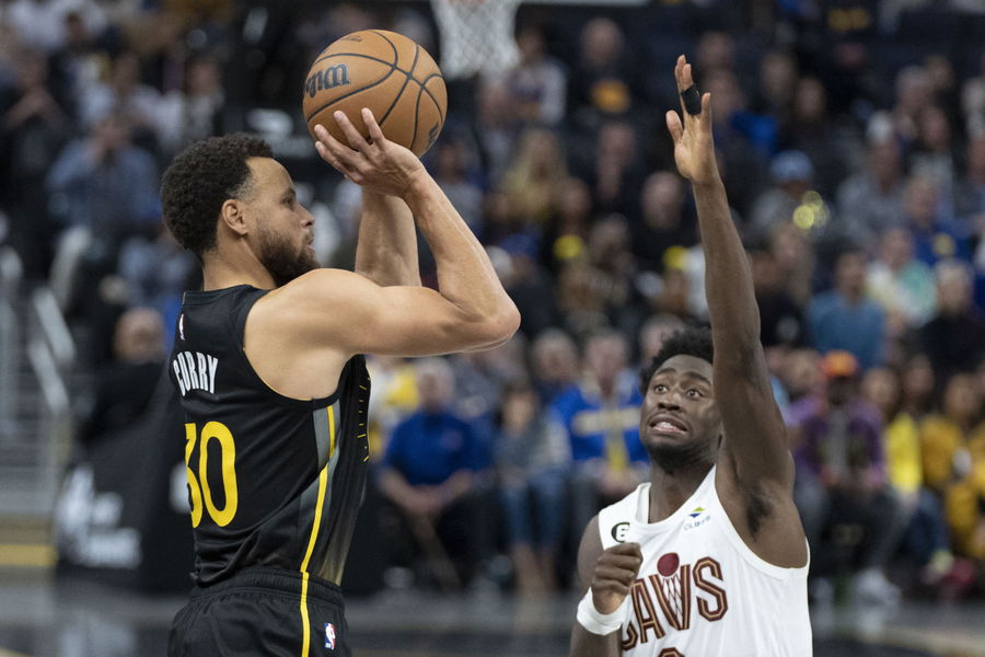 November 11, 2022; San Francisco, California, USA; Golden State Warriors guard Stephen Curry (30) shoots the basketball against Cleveland Cavaliers guard Caris LeVert (3) during the fourth quarter at Chase Center. Mandatory Credit: Kyle Terada-USA TODAY Sports