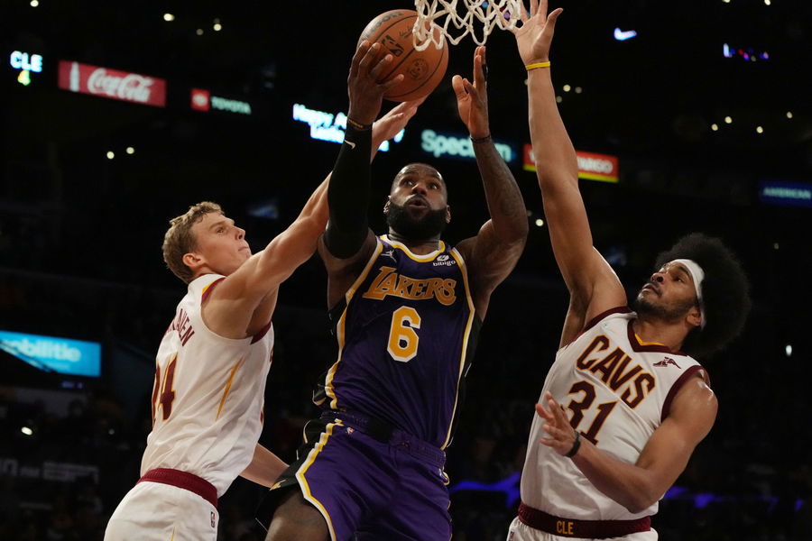 Oct 29, 2021; Los Angeles, California, USA; Los Angeles Lakers forward LeBron James (6) moves in for a basket against Cleveland Cavaliers forward Lauri Markkanen (24) and center Jarrett Allen (31) during the second half at Staples Center. Mandatory Credit: Kirby Lee-USA TODAY Sports