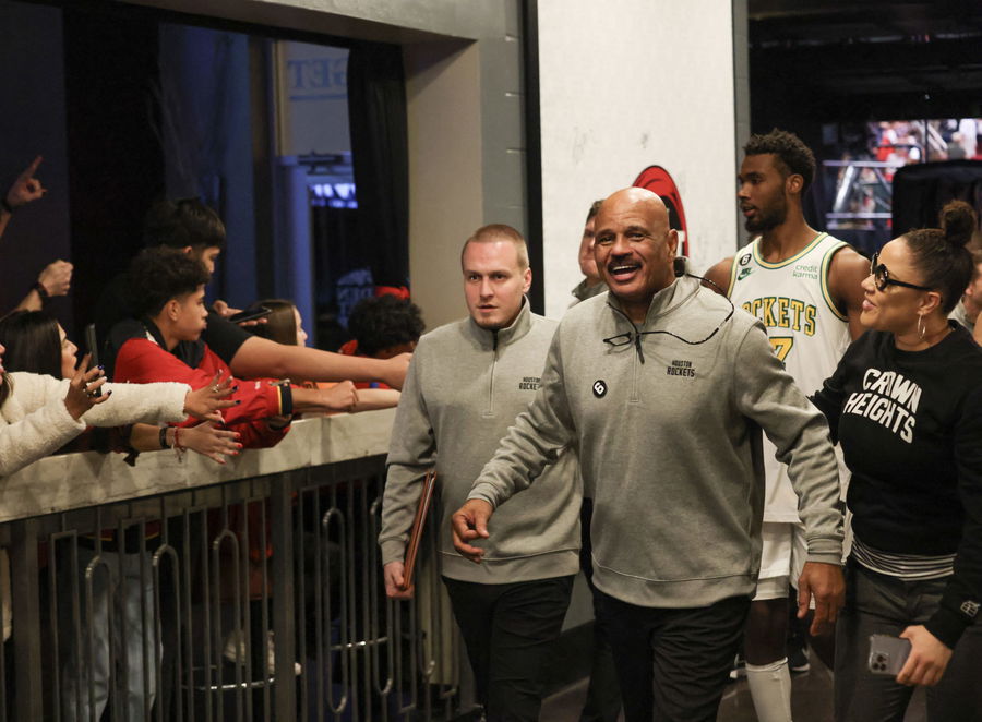 Dec 11, 2022; Houston, Texas, USA; Houston Rockets assistant coach John Lucas celebrates the win over the Milwaukee Bucks with fans at Toyota Center. Mandatory Credit: Thomas B. Shea-USA TODAY Sports