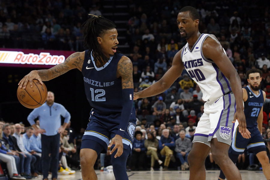 Jan 1, 2023; Memphis, Tennessee, USA; Memphis Grizzlies guard Ja Morant (12) passes the ball behind his back as Sacramento Kings forward Harrison Barnes (40) defends during the second half at FedExForum. Mandatory Credit: Petre Thomas-USA TODAY Sports
