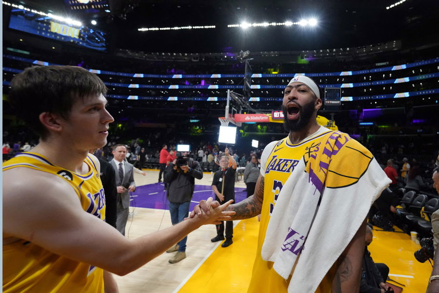 May 8, 2023; Los Angeles, California, USA; Los Angeles Lakers forward Anthony Davis (3) and guard Austin Reaves (15) celebrate after game four of the 2023 NBA playoffs at Crypto.com Arena. Mandatory Credit: Kirby Lee-USA TODAY Sports