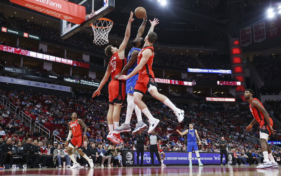 Jan 2, 2023; Houston, Texas, USA; Dallas Mavericks guard Theo Pinson (1) attempts to score a basket as Houston Rockets center Alperen Sengun (28) and guard Garrison Mathews (25) defend during the fourth quarter at Toyota Center. Mandatory Credit: Troy Taormina-USA TODAY Sports