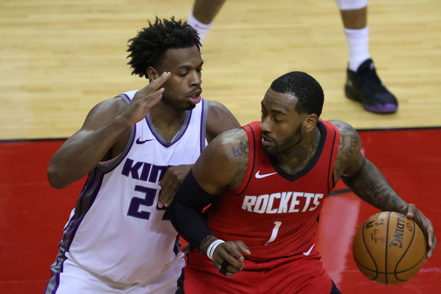 Jan 2, 2021; Houston, Texas, USA; John Wall #1 of the Houston Rockets controls the ball against Buddy Hield #24 of the Sacramento Kings during the fourth quarter of a game at Toyota Center on January 02, 2021 in Houston, Texas. Mandatory Credit: Carmen Mandato/Pool Photo-USA TODAY Sports