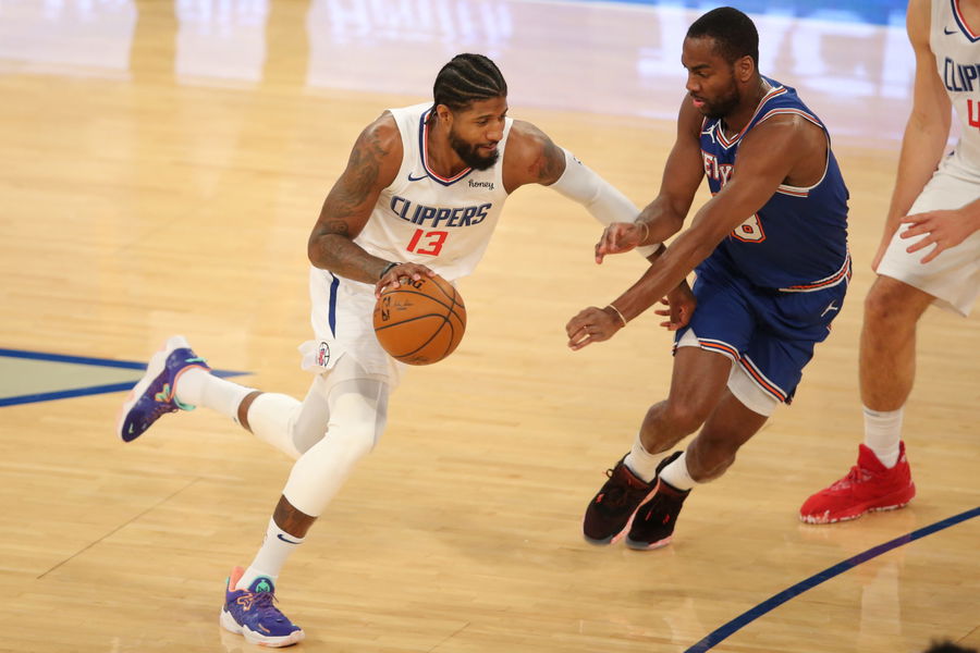Jan 31, 2021; New York, New York, USA; LA Clippers shooting guard Paul George (13) controls the ball against New York Knicks shooting guard Alec Burks (18) during the second quarter at Madison Square Garden. Mandatory Credit: Brad Penner-USA TODAY Sports