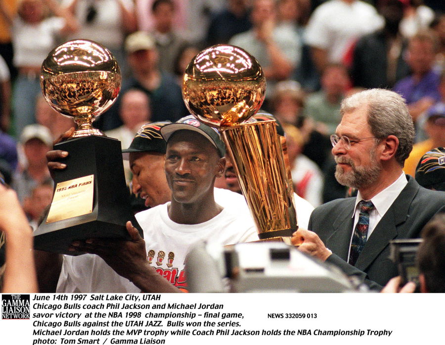 Phil Jackson And Michael Jordan Lift Trophies After Winning Their Sixth Straight Nba Title. (Photo By Tom Smart/Getty Images)
