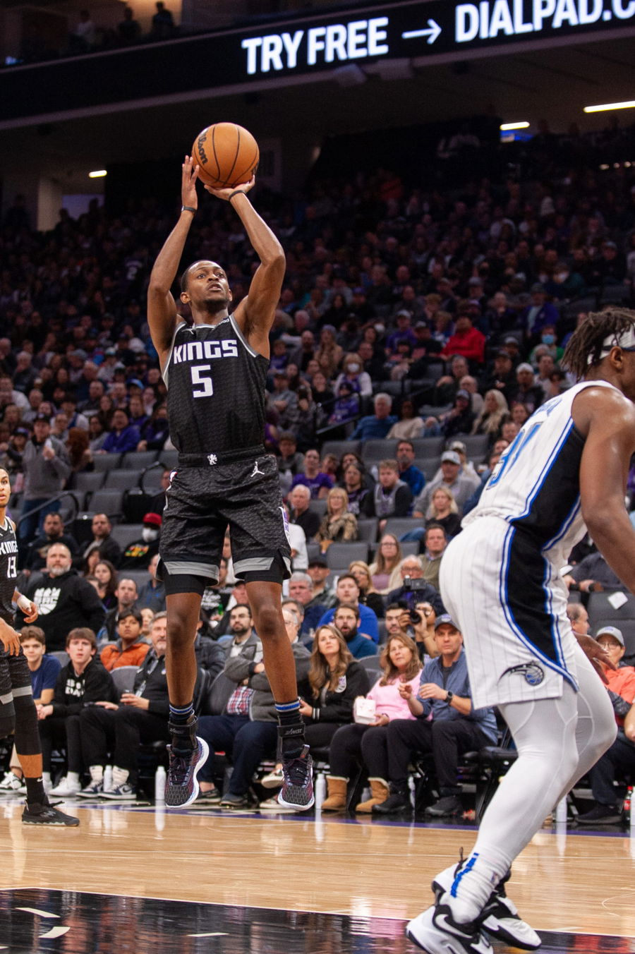 Jan 9, 2023; Sacramento, California, USA; Sacramento Kings guard De’Aaron Fox (5) takes a jump shot during the third quarter against the Orlando Magic at Golden 1 Center. Mandatory Credit: Ed Szczepanski-USA TODAY Sports