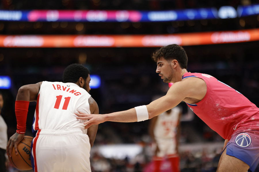 Dec 12, 2022; Washington, District of Columbia, USA; Brooklyn Nets guard Kyrie Irving (11) holds the ball as Washington Wizards forward Deni Avdija (9) defends in the first quarter at Capital One Arena. Mandatory Credit: Geoff Burke-USA TODAY Sports