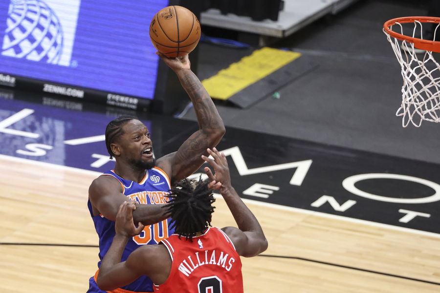 Feb 1, 2021; Chicago, Illinois, USA; New York Knicks forward Julius Randle (30) shoots against Chicago Bulls forward Patrick Williams (9) during the second half of an NBA game at United Center. Mandatory Credit: Kamil Krzaczynski-USA TODAY Sports