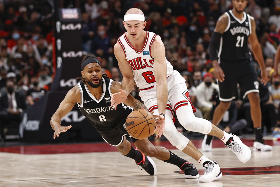 Nov 8, 2021; Chicago, Illinois, USA; Brooklyn Nets guard Patty Mills (8) fouls Chicago Bulls guard Alex Caruso (6) during the second half at United Center. Mandatory Credit: Kamil Krzaczynski-USA TODAY Sports