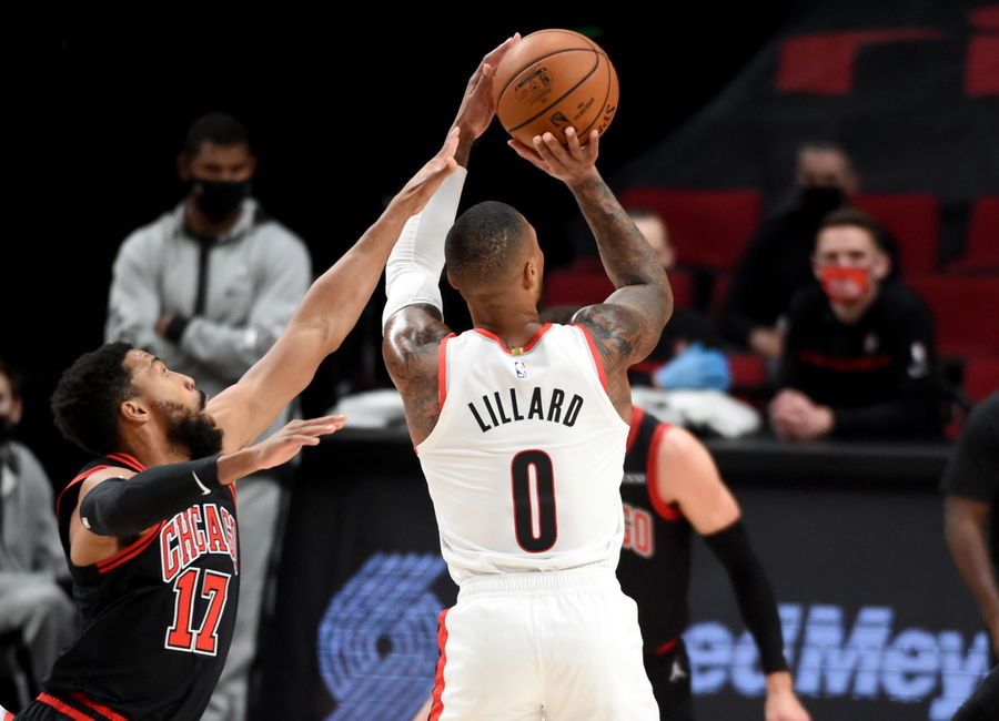 Jan 5, 2021; Portland, Oregon, USA; Portland Trail Blazers guard Damian Lillard (0) hits a shot over Chicago Bulls guard Garrett Temple (17) during the first half of the game at Moda Center. Mandatory Credit: Steve Dykes-USA TODAY Sports