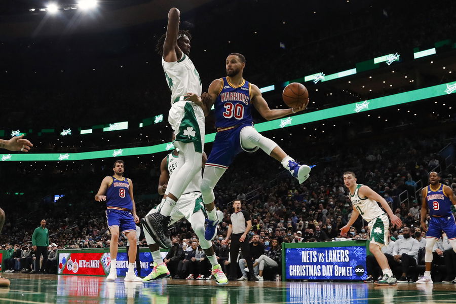 Dec 17, 2021; Boston, Massachusetts, USA; Golden State Warriors guard Stephen Curry (30) looks to pass around Boston Celtics center Robert Williams III (44) during the first quarter at TD Garden. Mandatory Credit: Winslow Townson-USA TODAY Sports