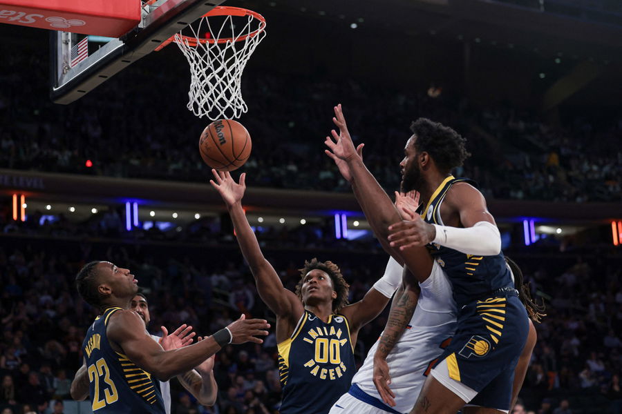 Apr 9, 2023; New York, New York, USA; Indiana Pacers guard Bennedict Mathurin (00) rebounds against New York Knicks center Mitchell Robinson (23) during the second half at Madison Square Garden. Mandatory Credit: Vincent Carchietta-USA TODAY Sports