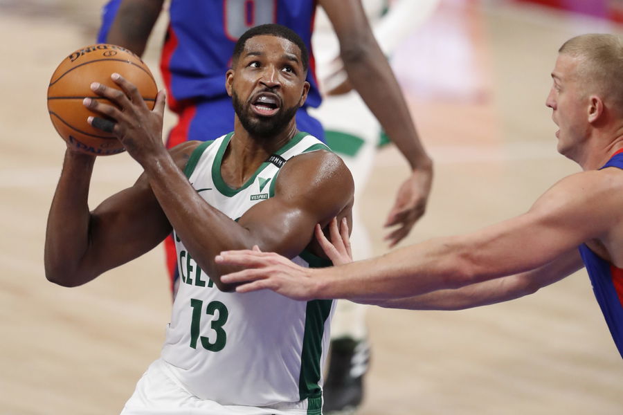Jan 3, 2021; Detroit, Michigan, USA; Boston Celtics center Tristan Thompson (13) gets defended by Detroit Pistons center Mason Plumlee (24) during the third quarter at Little Caesars Arena. Mandatory Credit: Raj Mehta-USA TODAY Sports