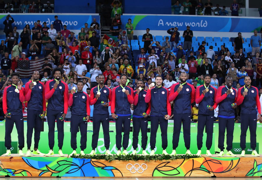 The basketball team of the USA displays their Gold medals at the medal ceremony after defeating Serbia during the Basketball Men’s Gold Medal Game during the Rio 2016 Olympic Games at the Carioca Arena 1 in the Olympic Park in Rio de Janeiro, Brazil, 21 August 2016. Photo: Friso Gentsch/dpa | usage worldwide (Photo by Friso Gentsch/picture alliance via Getty Images)
