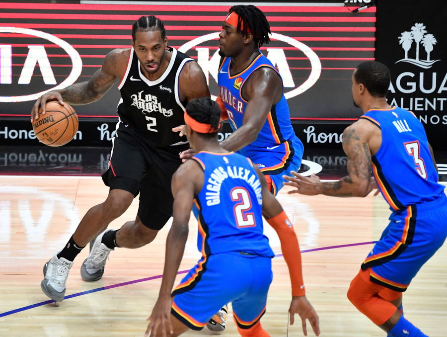 Jan 24, 2021; Los Angeles, California, USA; LA Clippers forward Kawhi Leonard (2) moves the ball against Oklahoma City Thunder forward Luguentz Dort (5), guard George Hill (3) and guard Shai Gilgeous-Alexander (2) during the third quarter at Staples Center. Mandatory Credit: Robert Hanashiro-USA TODAY Sports