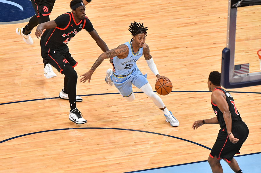 Feb 8, 2021; Memphis, Tennessee, USA; Memphis Grizzlies guard Ja Morant (12) goes to the basket against Toronto Raptors forward Pascal Siakam (43) during the first half at FedExForum. Mandatory Credit: Justin Ford-USA TODAY Sports