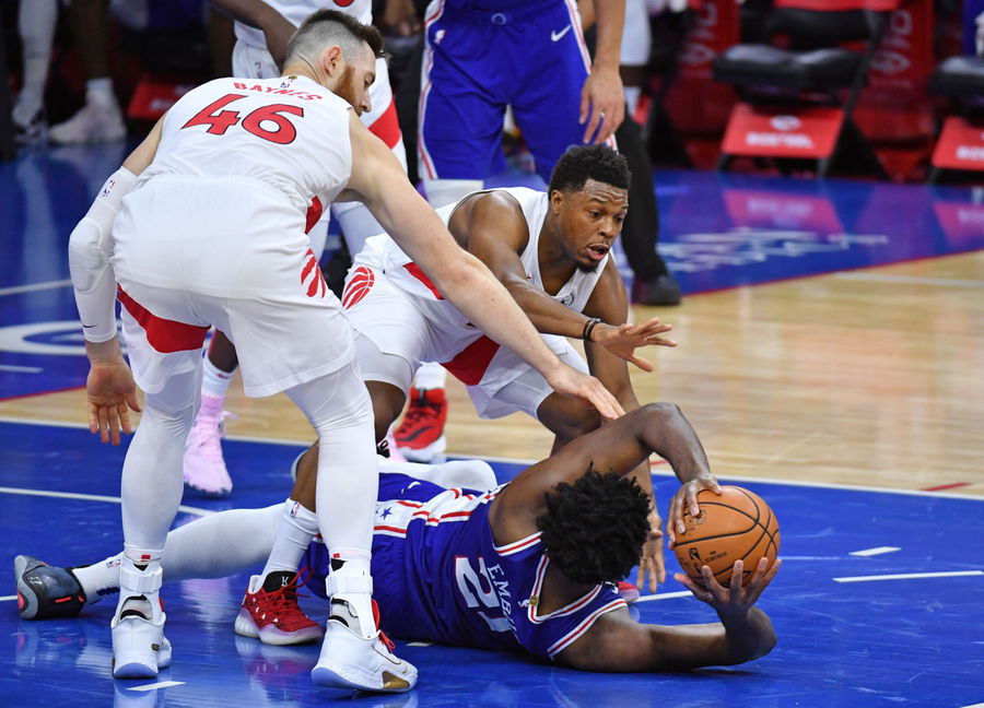Dec 29, 2020; Philadelphia, Pennsylvania, USA; Philadelphia 76ers center Joel Embiid (21) looks to pass as he grabs a loose ball against Toronto Raptors center Aron Baynes (46) and guard Kyle Lowry (7) during the second quarter at Wells Fargo Center. Mandatory Credit: Eric Hartline-USA TODAY Sports