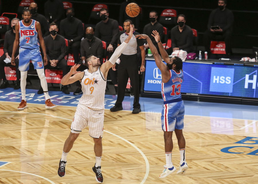 Nets guard James Harden shoots over Magic center Nikola Vucevic in the third quarter at Barclays Center. Mandatory Credit: Wendell Cruz-USA TODAY Sports