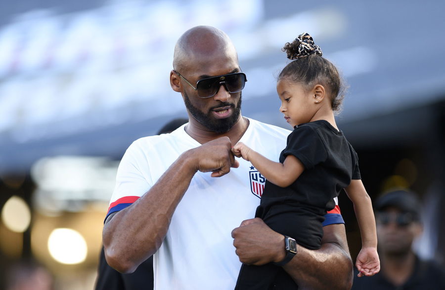 CALIFORNIA , UNITED STATES – 3 August 2019; Retired NBA star Kobe Bryant and daughter Bianka Bella prior to the Women’s International Friendly match between USA and Republic of Ireland at Rose Bowl in Pasadena, California, USA. (Photo By Cody Glenn/Sportsfile via Getty Images)