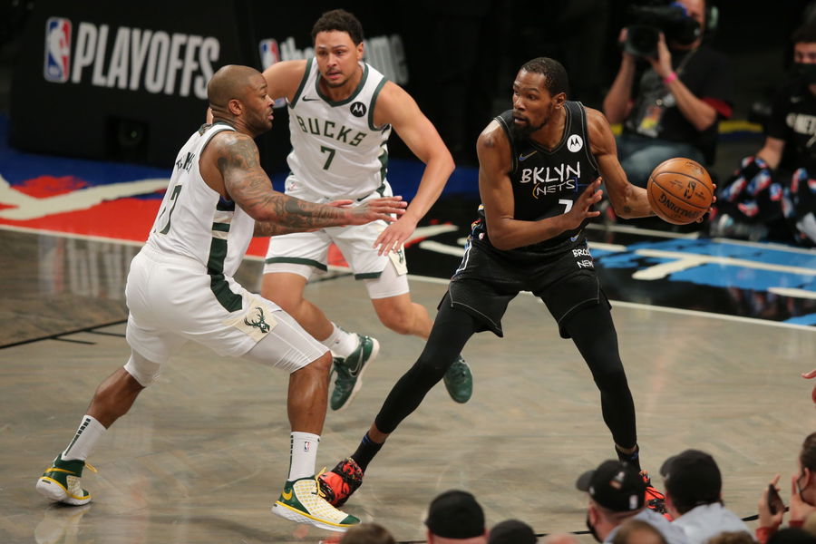 Jun 15, 2021; Brooklyn, New York, USA; Brooklyn Nets power forward Kevin Durant (7) controls the ball against Milwaukee Bucks power forward P.J. Tucker (17) and Bucks guard Bryn Forbes (7) during the first quarter of game five of the second round of the 2021 NBA Playoffs at Barclays Center. Mandatory Credit: Brad Penner-USA TODAY Sports