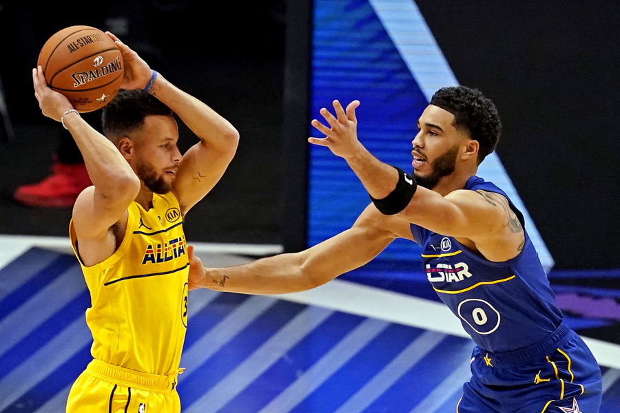 Mar 7, 2021; Atlanta, Georgia, USA; Team LeBron guard Stephen Curry of the Golden State Warriors (30) handles the ball against Team Durant forward Jayson Tatum of the Boston Celtics (0) during the 2021 NBA All-Star Game at State Farm Arena. Mandatory Credit: Dale Zanine-USA TODAY Sports