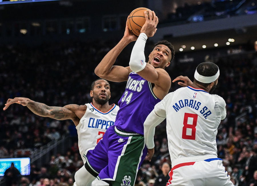 Feb 2, 2023; Milwaukee, Wisconsin, USA; Milwaukee Bucks forward Giannis Antetokounmpo (34) looks for a shot against Los Angeles Clippers forward Marcus Morris Sr. (8) in the third quarter at Fiserv Forum. Mandatory Credit: Benny Sieu-USA TODAY Sports