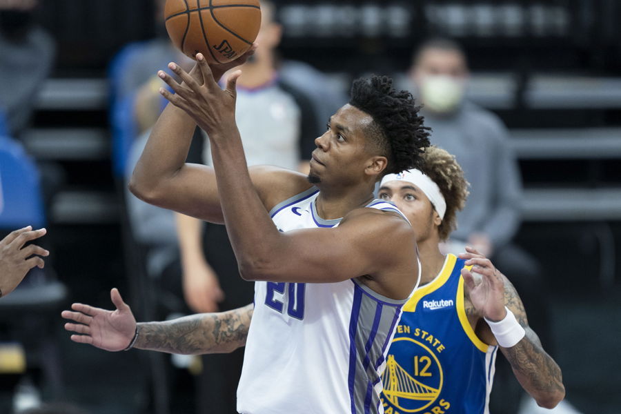 December 17, 2020; Sacramento, California, USA; Sacramento Kings center Hassan Whiteside (20) shoots the basketball against Golden State Warriors forward Kelly Oubre Jr. (12) during the third quarter at Golden 1 Center. Mandatory Credit: Kyle Terada-USA TODAY Sports
