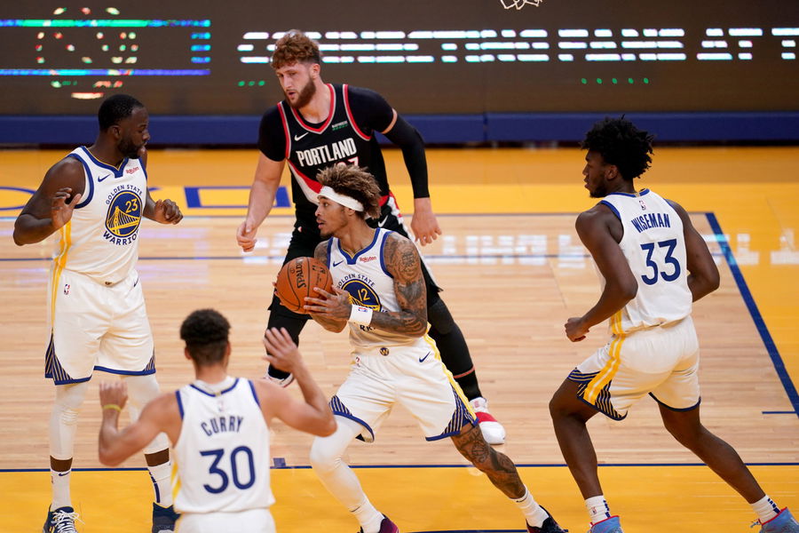 Jan 1, 2021; San Francisco, California, USA; Golden State Warriors forward Kelly Oubre Jr. (12) holds onto a rebound against the Portland Trail Blazers in the first quarter at the Chase Center. Mandatory Credit: Cary Edmondson-USA TODAY Sports
