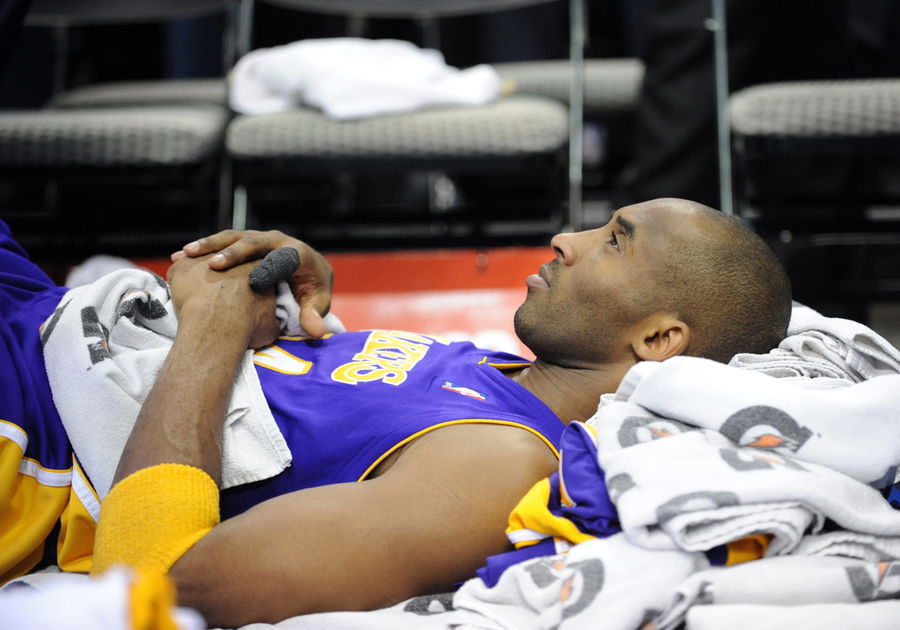 January 13, 2009: Los Angeles Lakers guard Kobe Bryant #24 lays on his back after being removed from a game the previous night for back spasms during an NBA game between the Los Angeles Lakers and the Dallas Mavericks at the American Airlines Center in Dallas, TX Los Angeles defeated Dallas 100-95 (Photo by Albert Pena/Icon SMI/Icon Sport Media via Getty Images)