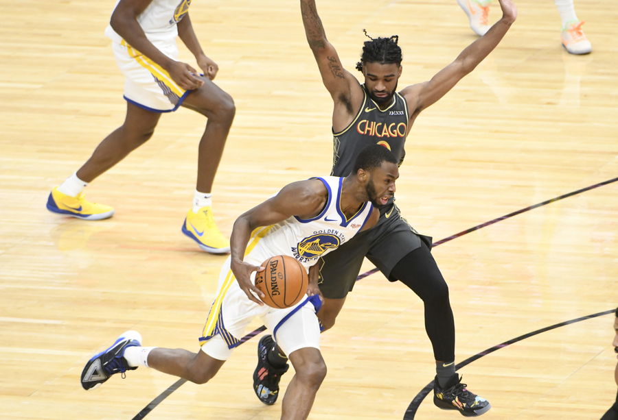 Dec 27, 2020; Chicago, Illinois, USA; Golden State Warriors forward Andrew Wiggins (22) drives the ball defended by Chicago Bulls guard Coby White (0) during the second half at United Center. Mandatory Credit: David Banks-USA TODAY Sports