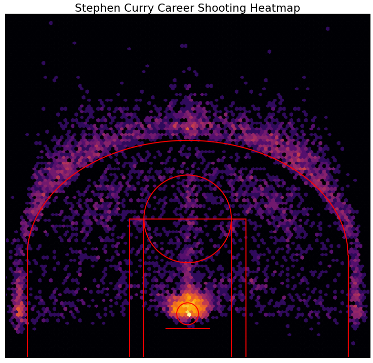 Stephen Curry Career Shooting Heatmap of Made Shots (Valid as of 24th Jan 2022). (Brighter the spot, more the number of shots scored from there)